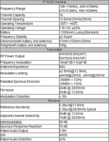 | Output Power | UHF: 4 W / 2 W / 0.5 W · VHF: 5 W / 2 W / 0.5 W |